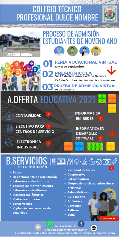 Tel/ Fax 2553-6190E-mail:ctp.dulcenombre@mep.go.cr Dirección: 50m oeste y 50 m sur del cementerio de Dulce Nombre, Cartago, Costa Rica.