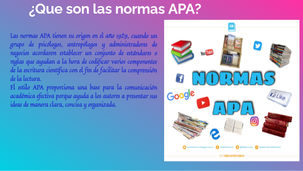 Las normas APA tienen su origen en el año 1929, cuando un grupo de psicólogos, antropólogos y administradores de negocios acordaron establecer un conjunto de estándares o reglas que ayudan a la hora de codificar varios componentes de la escritura científica con el fin de facilitar la comprensión de la lectura.El estilo APA proporciona una base para la comunicación académica efectiva porque ayuda a los autores a presentar sus ideas de manera clara, concisa y organizada.