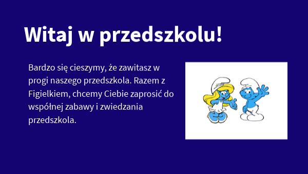 Bardzo się cieszymy, że zawitasz w progi naszego przedszkola. Razem z Figielkiem, chcemy Ciebie zaprosić do współnej zabawy i zwiedzania przedszkola.