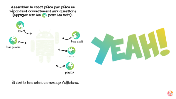 Assembler le robot pièce par pièce en répondant correctement aux questions (appuyer sur les pour les voir) .