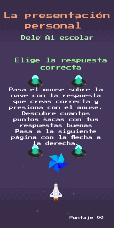 Pasa el mouse sobre la nave con la respuesta que creas correcta y presiona con el mouse. Descubre cuantos puntos sacas con tus respuestas buenas Pasa a la siguiente página con la flecha a la derecha.