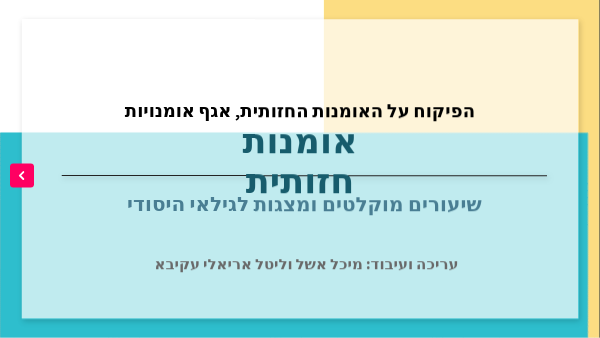 , למורות ולמורים שלום וברכה הערכה שלפניכם הנה כלי עזר לעבודה עם מאגר השיעורים המצולמים באומנות חזותית את השיעורים הגו, כתבו והקליטו מורות ומורים מרחבי הארץ בשיתוף עם צוותי הפיקוח המחוזיים והארציים. בכל עמוד יופיעו השיעור המוקלט ובנוסף: טת תקציר הנושאים המרכזיים מסומן ב-ן טבלת מושגים, ערכים ומיומנויות מסומן ב- ת לינק להורדת המצגת מסומן ב- ת !מאחלות לכם/ן עבודה פורייה ושנה נפלאה צוות הפיקוח על האומנות החזותית, אגף אומנויות