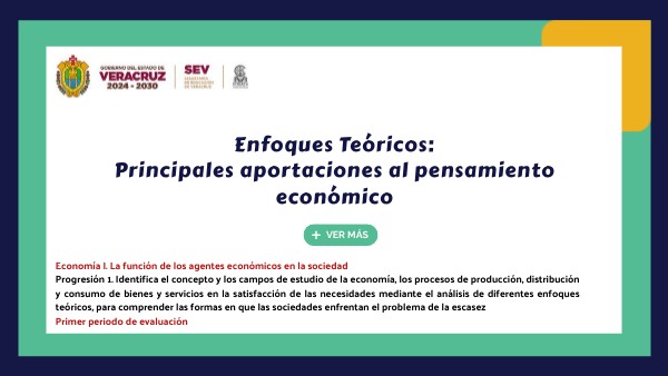 Economía I. La función de los agentes económicos en la sociedadProgresión 1. Identifica el concepto y los campos de estudio de la economía, los procesos de producción, distribución y consumo de bienes y servicios en la satisfacción de las necesidades mediante el análisis de diferentes enfoques teóricos, para comprender las formas en que las sociedades enfrentan el problema de la escasez Primer periodo de evaluación