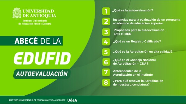 La autoevaluación es un proceso que hace parte de la cotidianidad en la Universidad de Antioquia. Consiste en llevar a cabo una evaluación rigurosa de los programas y procesos, mediante unos criterios de calidad claramente establecidos, para detectar en qué somos fuertes y en qué debemos mejorar, en todo lo relacionado con la calidad de la educación que ofrecemos. En el Instituto de Educación Física y Deporte, desde hace cerca de dos décadas hemos puesto en práctica las estrategias necesarias para mirarnos a nosotros mismos y valorarnos, de acuerdo con criterios propios o propuestos por el Ministerio de Educación Nacional con sus diferentes organismos e instancias.