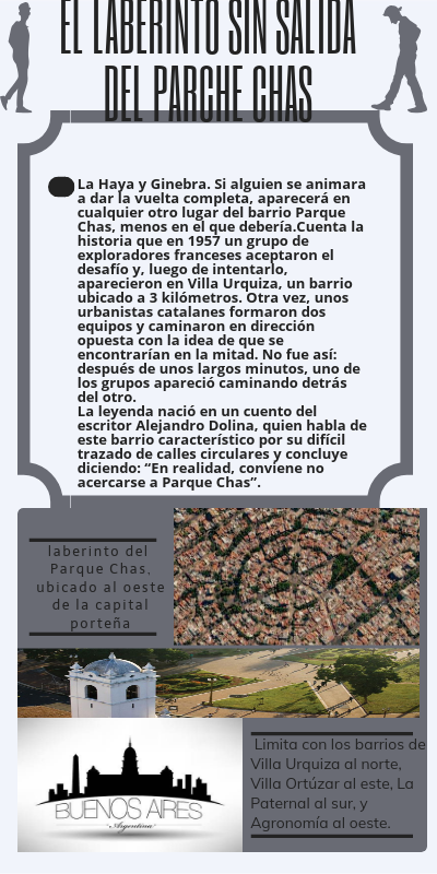 La Haya y Ginebra. Si alguien se animara a dar la vuelta completa, aparecerá en cualquier otro lugar del barrio Parque Chas, menos en el que debería.Cuenta la historia que en 1957 un grupo de exploradores franceses aceptaron el desafío y, luego de intentarlo, aparecieron en Villa Urquiza, un barrio ubicado a 3 kilómetros. Otra vez, unos urbanistas catalanes formaron dos equipos y caminaron en dirección opuesta con la idea de que se encontrarían en la mitad. No fue así: después de unos largos minutos, uno de los grupos apareció caminando detrás del otro. La leyenda nació en un cuento del escritor Alejandro Dolina, quien habla de este barrio característico por su difícil trazado de calles circulares y concluye diciendo: “En realidad, conviene no acercarse a Parque Chas”.