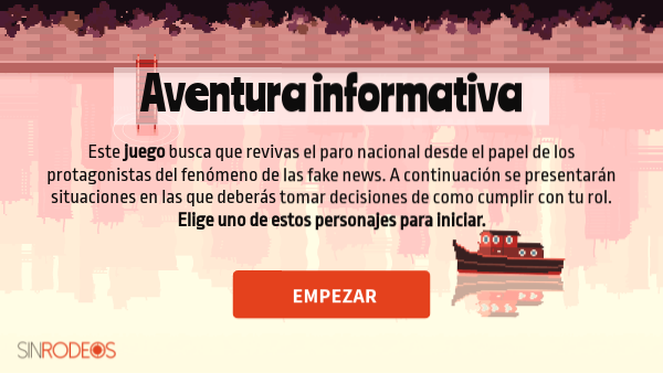 Este juego busca que revivas el paro nacional desde el papel de los protagonistas del fenómeno de las fake news. A continuación se presentarán situaciones en las que deberás tomar decisiones de como cumplir con tu rol. Elige uno de estos personajes para iniciar.
