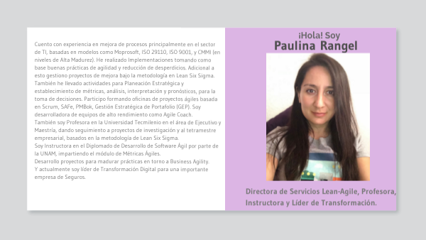 Cuento con experiencia en mejora de procesos principalmente en el sector de TI, basadas en modelos como Moprosoft, ISO 29110, ISO 9001, y CMMI (en niveles de Alta Madurez). He realizado Implementaciones tomando como base buenas prácticas de agilidad y reducción de desperdicios. Adicional a esto gestiono proyectos de mejora bajo la metodología en Lean Six Sigma. También he llevado actividades para Planeación Estratégica y establecimiento de métricas, análisis, interpretación y pronósticos, para la toma de decisiones. Participo formando oficinas de proyectos ágiles basada en Scrum, SAFe, PMBok, Gestión Estratégica de Portafolio (GEP). Soy desarrolladora de equipos de alto rendimiento como Agile Coach. También soy Profesora en la Universidad Tecmilenio en el área de Ejecutivo y Maestría, dando seguimiento a proyectos de investigación y al tetramestre empresarial, basados en la metodología de Lean Six Sigma. Soy Instructora en el Diplomado de Desarrollo de Software Ágil por parte de la UNAM, impartiendo el módulo de Métricas Ágiles. Desarrollo proyectos para madurar prácticas en torno a Business Agility. Y actualmente soy líder de Transformación Digital para una importante empresa de Seguros.