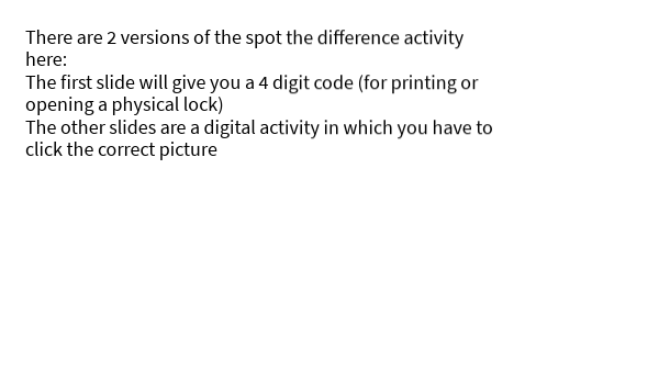There are 2 versions of the spot the difference activity here:The first slide will give you a 4 digit code (for printing or opening a physical lock) The other slides are a digital activity in which you have to click the correct picture