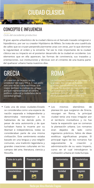 El gran aporte urbanístico de la ciudad clásica es el llamado trazado ortogonal o hipodámico, por ser su creador Hipódamo de Mileto. Se trata de una cuadrícula de calles que se cruzan perpendicularmente unas con otras, por lo que dominan la regularidad, el orden y la simetría. Tal vez lo más importante de la ciudad clásica sea su impacto en el posterior desarrollo de la ciudad en occidente. Los elementos que en ella aparecen, las formas de convivencia, sus trazados y orientaciones, sus instituciones y técnicas son el cimiento de una buena parte del quehacer urbano hasta nuestros días.