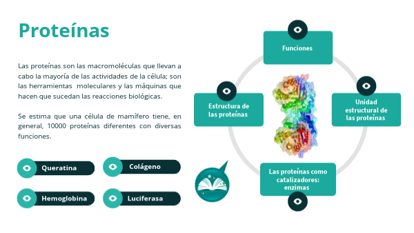 Las proteínas son las macromoléculas que llevan a cabo la mayoría de las actividades de la célula; son las herramientas moleculares y las máquinas que hacen que sucedan las reacciones biológicas. Se estima que una célula de mamífero tiene, en general, 10000 proteínas diferentes con diversas funciones.