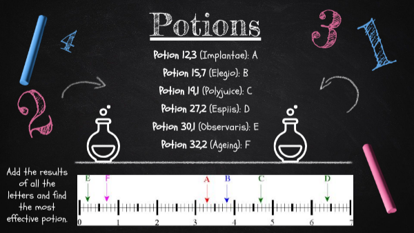 Potion 12,3 (Implantae): A Potion 15,7 (Elegio): B Potion 19,1 (Polyjuice): C Potion 27,2 (Espiis): D Potion 30,1 (Observaris): E Potion 32,2 (Ageing): F