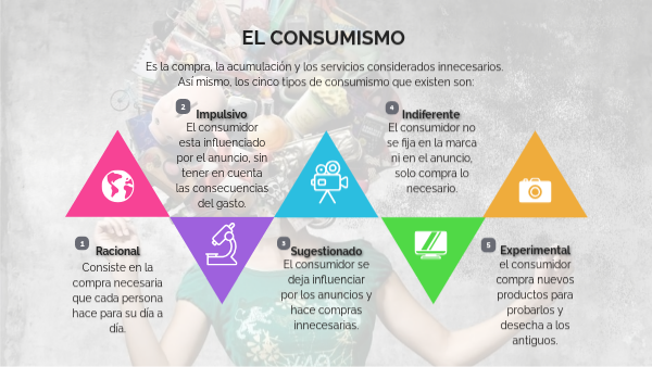 Es la compra, la acumulación y los servicios considerados innecesarios. Así mismo, los cinco tipos de consumismo que existen son:
