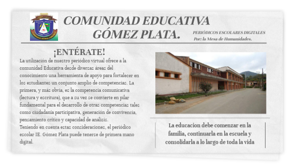 La utilización de nuestro periódico virtual ofrece a la comunidad Educativa desde diversas áreas del conocimiento una herramienta de apoyo para fortalecer en los estudiantes un conjunto amplio de competencias. La primera, y más obvia, es la competencia comunicativa (lectura y escritura), que a su vez se convierte en pilar fundamental para el desarrollo de otras competencias tales como ciudadanía participativa, generación de convivencia, pensamiento crítico y capacidad de análisis. Teniendo en cuenta estas consideraciones, el periódico escolar IE. Gómez Plata puede tenerse de primera mano digital.