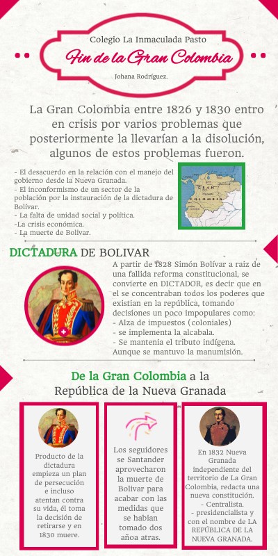 A partir de 1828 Simón Bolívar a raiz de una fallida reforma constitucional, se convierte en DICTADOR, es decir que en el se concentraban todos los poderes que existian en la república, tomando decisiones un poco impopulares como: - Alza de impuestos (coloniales) - se implementa la alcabala. - Se mantenia el tributo indígena. Aunque se mantuvo la manumisión.