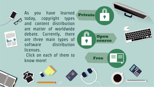 As you have learned today, copyright types and content distribution are matter of worldwide debate. Currently, there are three main types of software distribution licenses. Click on each of them to know more!