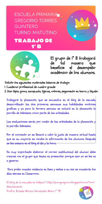 Trabajaré la planeación que se encuentra en el blog de la escuela, desarrollando las dos primeras semanas sus habilidades motrices graficas y ya para la tercera semana se incluirá en la planeación la parrilla de televisiva como parte de las actividades.Las evaluaciones serán por medio de las actividades de la planeación y la parrilla televisiva. Por el momento no se llevará a cabo la junta de manera virtual hasta que en su mayoría se recabe la información de los alumnos. Después se les avisara en el blog el día y la hora. Es muy importante elaborar el correo institucional del alumno debe crearse con el grupo que tenían en preescolar porque sino no se les va a generar. Para poder mandar evidencia en línea y estas a su vez se mandarán los días viernes en Classroom. El blog de la escuela es https:// http://primgregorio.blogspot.com/?m=1 Atentamente Profra. Brenda Marina Hernández Mora 1° “B”