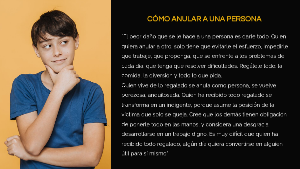 “El peor daño que se le hace a una persona es darle todo. Quien quiera anular a otro, solo tiene que evitarle el esfuerzo, impedirle que trabaje, que proponga, que se enfrente a los problemas de cada día, que tenga que resolver dificultades. Regálele todo: la comida, la diversión y todo lo que pida. Quien vive de lo regalado se anula como persona, se vuelve perezosa, anquilosada. Quien ha recibido todo regalado se transforma en un indigente, porque asume la posición de la víctima que solo se queja. Cree que los demás tienen obligación de ponerle todo en las manos, y considera una desgracia desarrollarse en un trabajo digno. Es muy difícil que quien ha recibido todo regalado, algún día quiera convertirse en alguien útil para sí mismo".