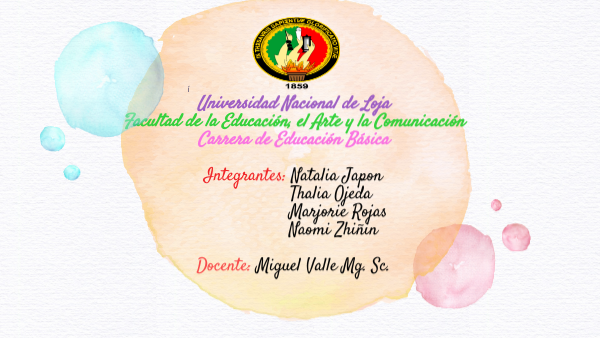 Universidad Nacional de LojaFacultad de la Educación, el Arte y la Comunicación Carrera de Educación Básica Integrantes: Natalia Japon Thalia Ojeda Marjorie Rojas Naomi Zhiñin Docente: Miguel Valle Mg. Sc.