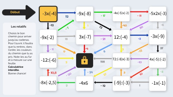 Choisis le bon chemin pour arriver jusqu'au cadenas. Pour l'ouvrir, il faudra que tu rentres, dans l'ordre, les couleurs du chemin que tu as pris. Note-les au fur et à mesure sur une feuille. Calculatrice interdite. Bonne chance!