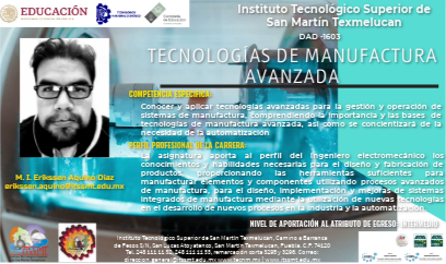 Conocer y aplicar tecnologías avanzadas para la gestión y operación de sistemas de manufactura, comprendiendo la importancia y las bases de tecnologías de manufactura avanzada, así como se concientizará de la necesidad de la automatización