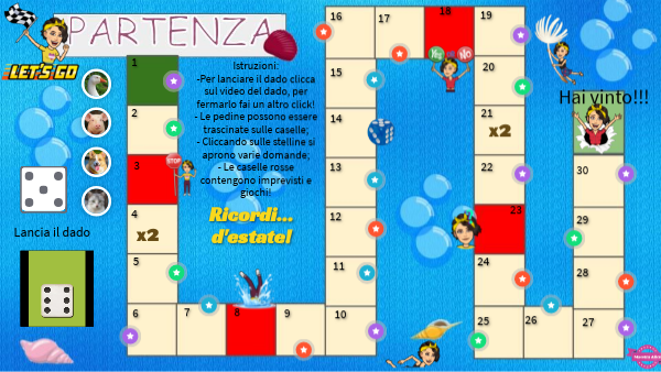 Istruzioni: -Per lanciare il dado clicca sul video del dado, per fermarlo fai un altro click! - Le pedine possono essere trascinate sulle caselle; - Cliccando sulle stelline si aprono varie domande; - Le caselle rosse contengono imprevisti e giochi!