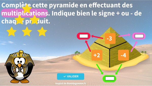 Complète cette pyramide en effectuant des multiplications. Indique bien le signe + ou - de chaque produit.
