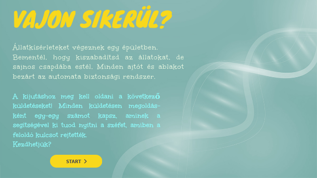 A kijutáshoz meg kell oldani a következő küldetéseket! Minden küldetésen megoldás-ként egy-egy számot kapsz, aminek a segítségével ki tuod nyitni a széfet, amiben a feloldó kulcsot rejtették.Kezdhetjük?