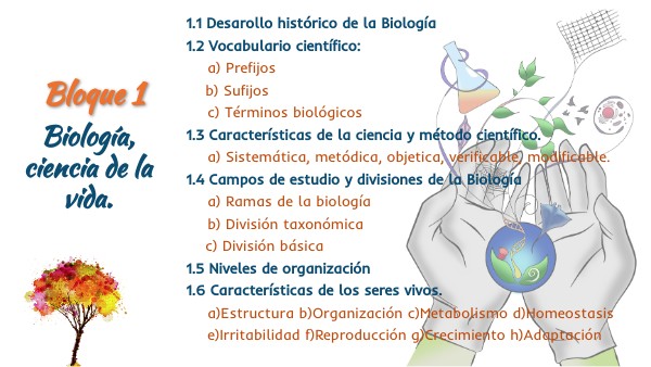 1.1 Desarollo histórico de la Biología 1.2 Vocabulario científico:a) Prefijos b) Sufijosc) Términos biológicos1.3 Características de la ciencia y método científico. a) Sistemática, metódica, objetica, verificable, modificable.1.4 Campos de estudio y divisiones de la Biología a) Ramas de la biología b) División taxonómica c) División básica 1.5 Niveles de organización 1.6 Características de los seres vivos. a)Estructura b)Organización c)Metabolismo d)Homeostasis e)Irritabilidad f)Reproducción g)Crecimiento h)Adaptación