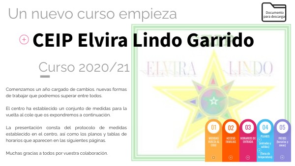 Comenzamos un año cargado de cambios. nuevas formas de trabajar que podremos superar entre todos. El centro ha establecido un conjunto de medidas para la vuelta al cole que os expondremos a continuación. La presentación consta del protocolo de medidas establecido en el centro, así como los planos y tablas de horarios que aparecen en las siguientes páginas. Muchas gracias a todos por vuestra colaboración.