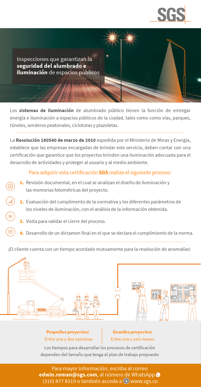 Los sistemas de iluminación de alumbrado público tienen la función de entregar energía e iluminación a espacios públicos de la ciudad, tales como como vías, parques, túneles, senderos peatonales, ciclotutas y plazoletas. La Resolución 180540 de marzo de 2010 expedida por el Ministerio de Minas y Energía, establece que las empresas encargadas de brindar este servicio, deben contar con una certificación que garantice que los proyectos brinden una iluminación adecuada para el desarrollo de actividades y proteger al usuario y al medio ambiente.
