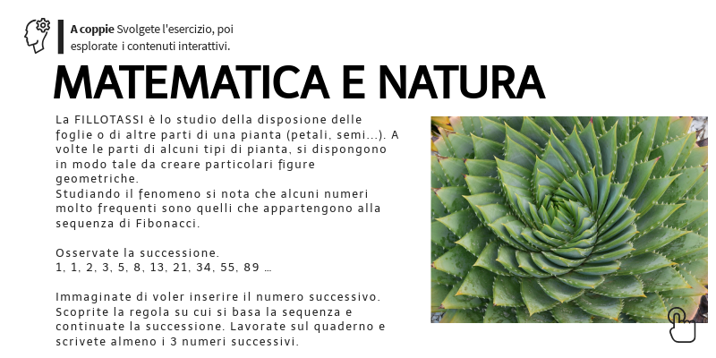 La FILLOTASSI è lo studio della disposione delle foglie o di altre parti di una pianta (petali, semi...). A volte le parti di alcuni tipi di pianta, si dispongono in modo tale da creare particolari figure geometriche. Studiando il fenomeno si nota che alcuni numeri molto frequenti sono quelli che appartengono alla sequenza di Fibonacci. Osservate la successione. 1, 1, 2, 3, 5, 8, 13, 21, 34, 55, 89 … Immaginate di voler inserire il numero successivo. Scoprite la regola su cui si basa la sequenza e continuate la successione. Lavorate sul quaderno e scrivete almeno i 3 numeri successivi.