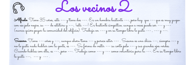 Alfredo. Tiene 35 años, está --- y tiene dos ---. Es un hombre bastante ---, pero hay que --- que es muy guapo: con ese pelo negro, su --- de estatura y ---, !está ---! Es bastante simpático, aunque a veces puede ser --- y --- (nunca quiere pagar la comunidad del edificio). Trabaja en --- y en su tiempo libre le gusta --- , --- y ---. Susana. Tiene --- años y ---, aunque ahora tiene --- y parece estar --- . Susana es una chica ---, siempre --- y no le gusta nada hablar con la gente, es ---. Su forma de vestir --- su corto pelo --- y sus grandes ojos verdes. Cuando hablas con ella, es ---, pero ---. Trabaja como --- y --- como voluntaria para la ---. En su tiempo libre le gusta ---, --- y --- .