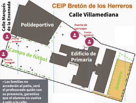 • Las familias no accederán al patio, será el profesorado quién con su presencia, garantice que el alumno no vuelva a salir a la calle.