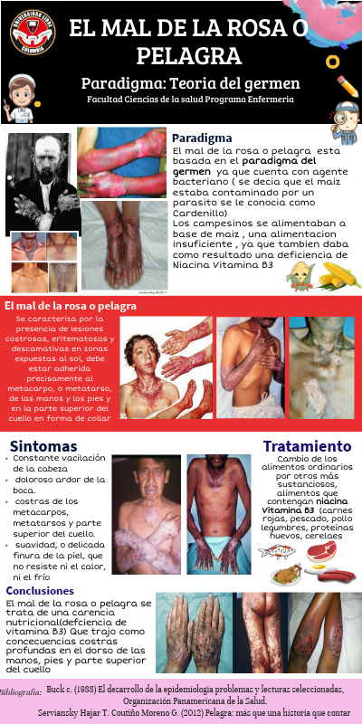 El mal de la rosa o pelagra esta basada en el paradigma del germen ya que cuenta con agente bacteriano ( se decia que el maiz estaba contaminado por un parasito se le conocia como Cardenillo) Los campesinos se alimentaban a base de maiz , una alimentacion insuficiente , ya que tambien daba como resultado una deficiencia de Niacina Vitamina B3