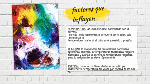 TEMPERATURA: las ENDOSPORAS bacterianas son la formas de vida más resistentes a la muerte por el calor, solo se alcanza la temperatura mortal si el calor está sometido a presión. HUMEDAD: la coagulación del protoplasma bacteriano (proteínas, enzimas) a temperaturas moderadas requiere humedad, y cuando se elimina la temperatura requerida para la coagulación se eleva rápidamente PRESIÓN: como tal, no tiene efecto, se necesita para mantener la temperatura del vapor por encima de los 100 °C.