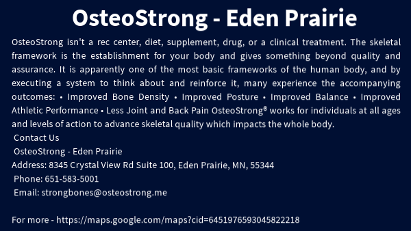 OsteoStrong isn't a rec center, diet, supplement, drug, or a clinical treatment. The skeletal framework is the establishment for your body and gives something beyond quality and assurance. It is apparently one of the most basic frameworks of the human body, and by executing a system to think about and reinforce it, many experience the accompanying outcomes: • Improved Bone Density • Improved Posture • Improved Balance • Improved Athletic Performance • Less Joint and Back Pain OsteoStrong® works for individuals at all ages and levels of action to advance skeletal quality which impacts the whole body. Contact Us OsteoStrong - Eden Prairie Address: 8345 Crystal View Rd Suite 100, Eden Prairie, MN, 55344 Phone: 651-583-5001 Email: strongbones@osteostrong.me For more - https://maps.google.com/maps?cid=6451976593045822218