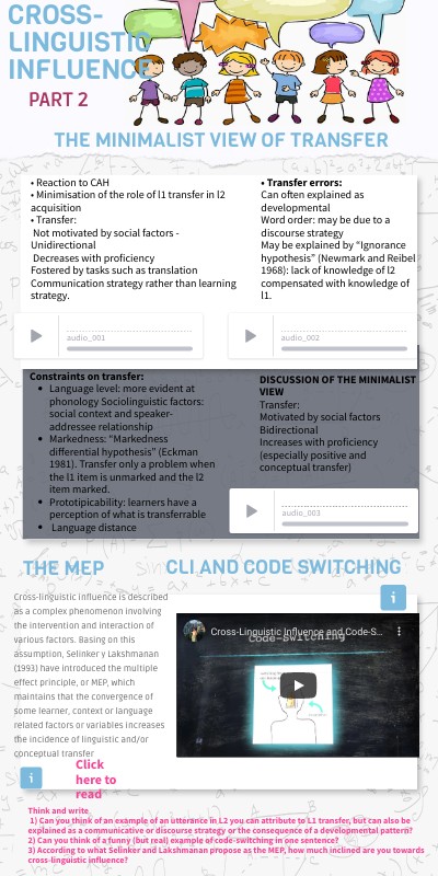 Think and write 1) Can you think of an example of an utterance in L2 you can attribute to L1 transfer, but can also be explained as a communicative or discourse strategy or the consequence of a developmental pattern? 2) Can you think of a funny (but real) example of code-switching in one sentence? 3) According to what Selinker and Lakshmanan propose as the MEP, how much inclined are you towards cross-linguistic influence?