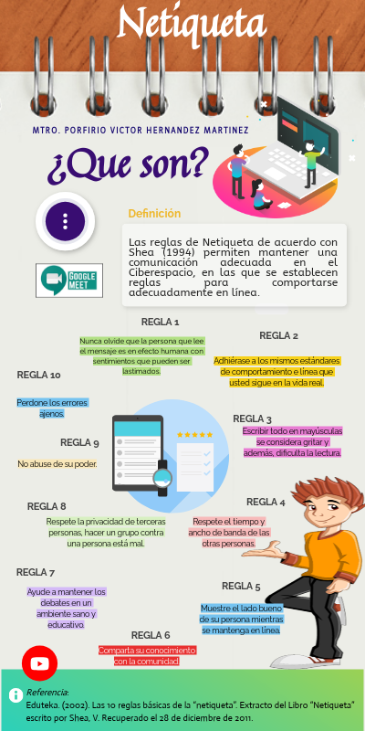 Referencia:Eduteka. (2002). Las 10 reglas básicas de la “netiqueta”. Extracto del Libro “Netiqueta” escrito por Shea, V. Recuperado el 28 de diciembre de 2011.