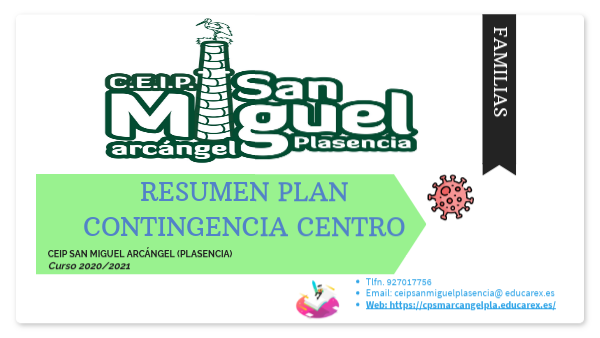 El 10 de septiembre de 2020, de forma general, TODO LOS ALUMNOS se incorporarán al centro en su horario y edificio correspondiente. En esta presentación de diapositivas las familias podéis ver un resumen más visual y práctico del Plan de Contingencia del Centro. Como ya os hemos informado en la reunión de inicio de curso, es un plan abierto y flexible en el que toda la comunidad educativa participamos, por ello estamos abiertos a cualquier sugerencia, modificación que de forma consensuada se estime oportuno.