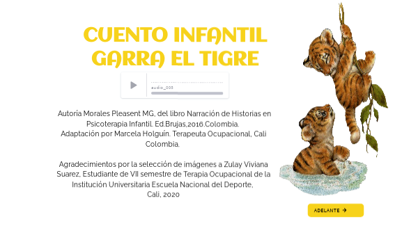 Autoría Morales Pleasent MG, del libro Narración de Historias en Psicoterapia Infantil. Ed.Brujas,2016.Colombia. Adaptación por Marcela Holguín. Terapeuta Ocupacional, Cali Colombia. Agradecimientos por la selección de imágenes a Zulay Viviana Suarez, Estudiante de VII semestre de Terapia Ocupacional de la Institución Universitaria Escuela Nacional del Deporte, Cali, 2020