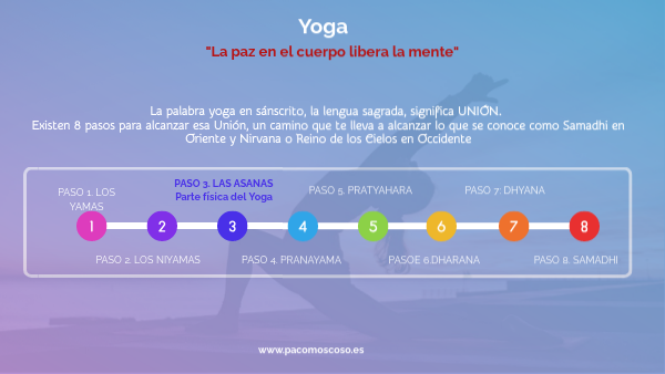 La palabra yoga en sánscrito, la lengua sagrada, significa UNIÓN. Existen 8 pasos para alcanzar esa Unión, un camino que te lleva a alcanzar lo que se conoce como Samadhi en Oriente y Nirvana o Reino de los Cielos en Occidente