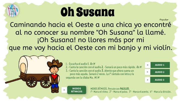 Caminando hacia el Oeste a una chica yo encontré al no conocer su nombre "Oh Susana" la llamé. ¡Oh Susana! no llores más por mi que me voy hacia el Oeste con mi banjo y mi violín.