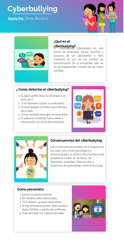 El Cyberbulling (ciberacoso) es una forma de amenazar, acosar, humillar o burlarse de un adolecente o niño mediante el uso de los medios de comunicación. En la actualidad esto se da principalmente a través de las redes sociales.