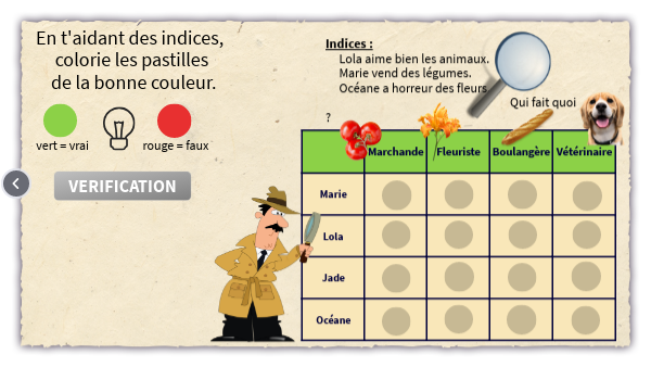 Indices : Lola aime bien les animaux. Marie vend des légumes. Océane a horreur des fleurs. Qui fait quoi ?