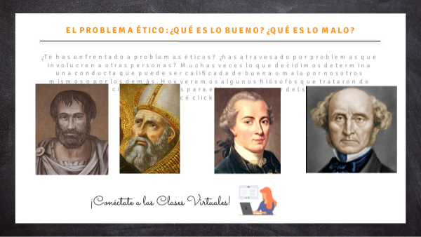 ¿Te has enfrentado a problemas éticos? ¿has atravesado por problemas que involucren a otras personas? Muchas veces lo que decidimos determina una conducta que puede ser calificada de buena o mala por nosotros mismos o por los demás. Hoy veremos algunos filósofos que trataron de reflexionar ciertos criterios para el buen accionar del ser humano. ¡Hacé click en ellos!