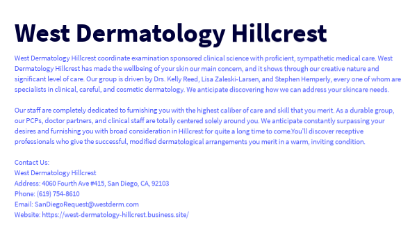 West Dermatology Hillcrest coordinate examination sponsored clinical science with proficient, sympathetic medical care. West Dermatology Hillcrest has made the wellbeing of your skin our main concern, and it shows through our creative nature and significant level of care. Our group is driven by Drs. Kelly Reed, Lisa Zaleski-Larsen, and Stephen Hemperly, every one of whom are specialists in clinical, careful, and cosmetic dermatology. We anticipate discovering how we can address your skincare needs. Our staff are completely dedicated to furnishing you with the highest caliber of care and skill that you merit. As a durable group, our PCPs, doctor partners, and clinical staff are totally centered solely around you. We anticipate constantly surpassing your desires and furnishing you with broad consideration in Hillcrest for quite a long time to come.You'll discover receptive professionals who give the successful, modified dermatological arrangements you merit in a warm, inviting condition. Contact Us: West Dermatology Hillcrest Address: 4060 Fourth Ave #415, San Diego, CA, 92103 Phone: (619) 754-8610 Email: SanDiegoRequest@westderm.com Website: https://west-dermatology-hillcrest.business.site/