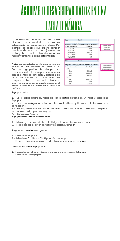 Agrupar datos 1.- En la tabla dinámica, haga clic con el botón derecho en un valor y seleccione Agrupar. 2.- En el cuadro Agrupar, seleccione las casillas Desde y Hasta y edite los valores, si es necesario. 3.- En Por, seleccione un período de tiempo. Para los campos numéricos, indique un intervalo numérico para cada grupo. 4.- Seleccione Aceptar. Agrupar elementos seleccionados 1.- Mantenga presionada la tecla Ctrl y seleccione dos o más valores. 2.- Haga clic con el botón derecho y seleccione Agrupar. Asignar un nombre a un grupo 1.- Seleccione el grupo. 2.- Seleccione Analizar > Configuración de campo. 3.- Cambie el nombre personalizado al que quiera y seleccione Aceptar. Desagrupar datos agrupados 1.- Haga clic con el botón derecho en cualquier elemento del grupo. 2.- Seleccione Desagrupar.