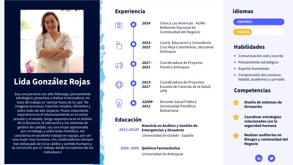 Soy una persona con alto liderazgo, pensamiento estrategico, proactiva, creativa e innovadora, mi base de trabajo es “pensar fuera de la caja” Re imaginar procesos, hacerlos simples, eficientes y sobre todo de alto impacto. Poseo importante experiencia en el relacionamiento en el sector privado y el estado, tengo experiencia en el ámbito de la docencia, la educación y los sistemas de gestión de calidad, soy una mujer apasionada por mi trabajo y sobre todo metódica, me caracteriza el excelente trabajo en equipo, por ser una mujer muy humana, mis colaboradores siempre han destacado de mi la calidez y sentido humano y la convicción por el trabajo desde los talentos de los individuos.l