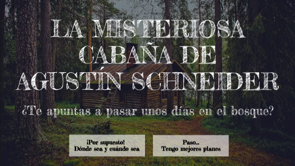 Tus amigos y tú ponéis rumbo a una cabaña en la Selva de Irati (Navarra) para pasar unos días de risas y buen rollo. Tras el viaje en el Ford Orion de 1990 de tu amigo Lito, llegáis a vuestro AirBnB, una cabaña muy molona en la mitad del bosque. El dueño, Agustín, un señor muy majo de unos 80 años, os da la bienvenida, os explica cómo funciona el termo de agua caliente, la cafetera italiana clásica, y os da las llaves, deseando que paséis un buen fin de semana. Os recuerda que debéis dejar la cabaña en perfectas condiciones el lunes 16 de marzo a las 12:00 horas.