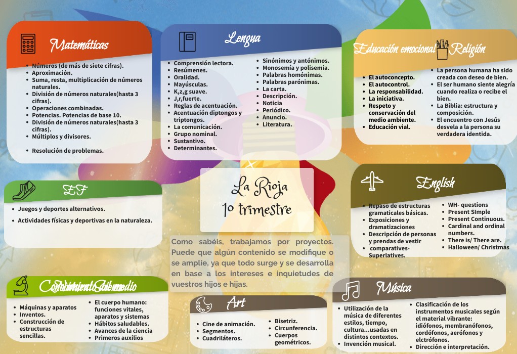 Como sabéis, trabajamos por proyectos. Puede que algún contenido se modifique o se amplíe, ya que todo surge y se desarrolla en base a los intereses e inquietudes de vuestros hijos e hijas.